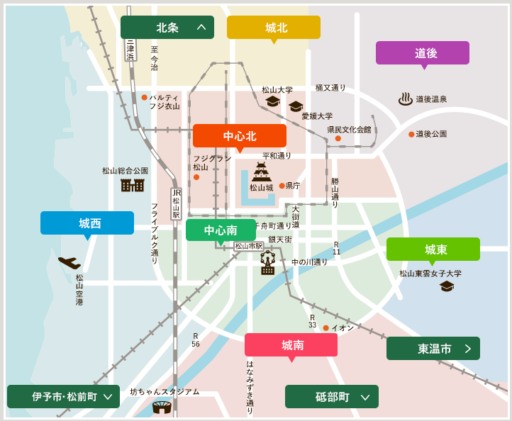 市駅や大街道など、松山の中心街へのアクセスがよく、買い物や通勤・通学に便利なのがポイント。